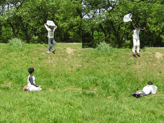 「もしかしたらレジ袋でチョットだけ飛べるんじゃないか」と思ったそうで。(左:次男 右:長男)