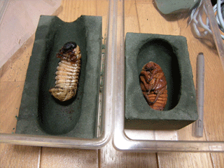 ♂はケースの底(っつてもマットが5cm位しかないからしょうがない)の角に蛹室造ってたので、