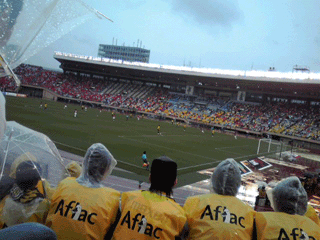 浦和のチームカラーの赤いポンチョ着てたのがまずかったかなぁ?